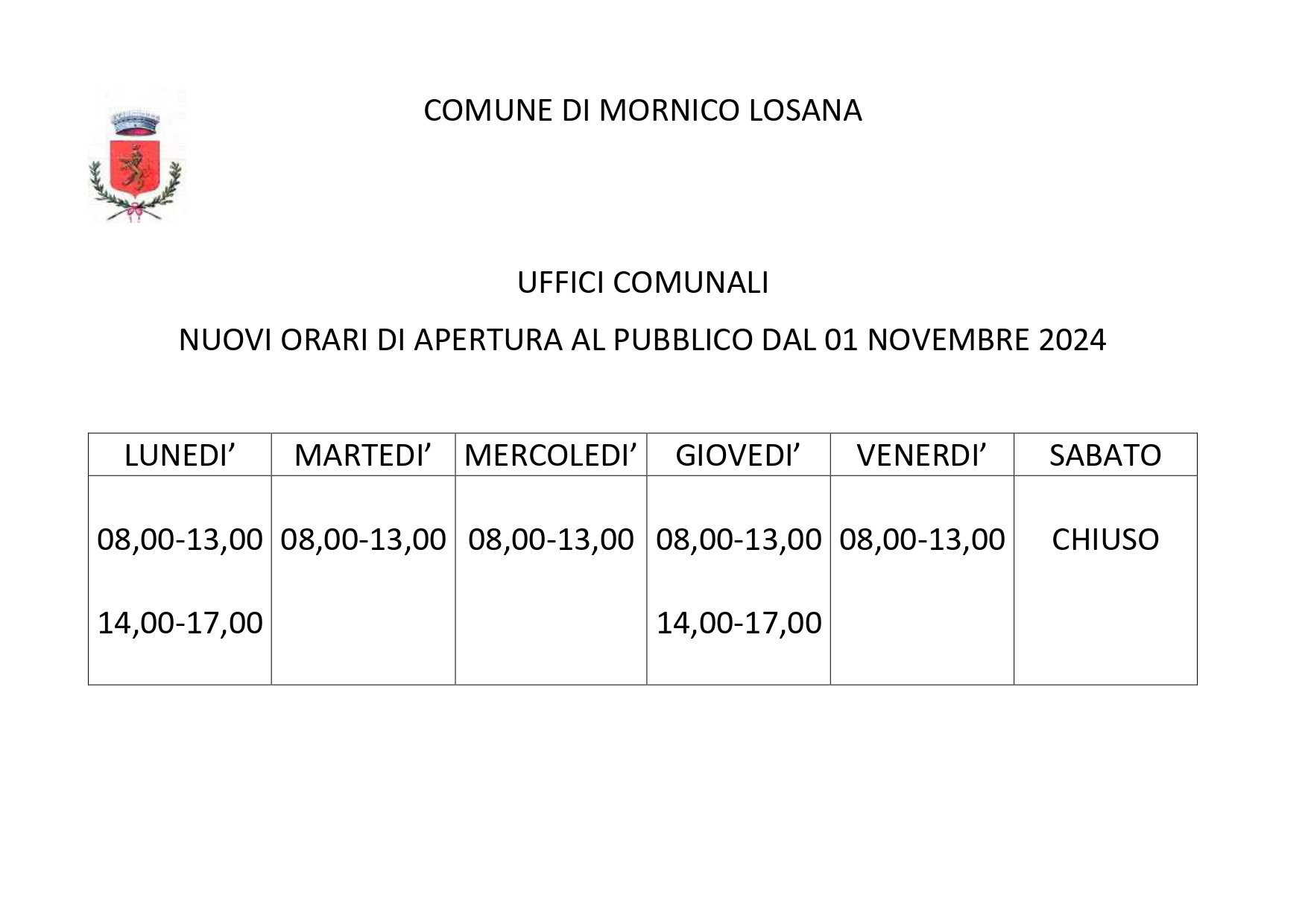 Descrizione Nuovi orari di apertura al pubblico degli Uffici comunali dal 01.11.2024Vedasi allegati Allegati Documenti Decreto Sindaco [.pdf 127,51 Kb - 24/10/2024] Nuovi orari dal 01.11.2024 [.pdf 20,86 Kb - 24/10/2024] A cura di Ufficio Relazioni al Pubblico Ultimo aggiornamento pagina: 25/10/2024 08:38:37